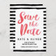 Este cartão moderno e chic Save the Date apresenta um fundo na moda preto e branco de faixas e a palavra "Save the Date" em cor vermelha. Esta placa também inclui um lado traseiro com padrão. Personalize este convite substituindo o texto do marcador de posição no modelo. Para obter mais opções, como alterar a fonte e seu tamanho, clique no botão "Personalizar". *Observe que a Marca d'água Zazzle que aparece na visualização de zoom NÃO aparecerá no produto impresso final © Rosewood e Citrus