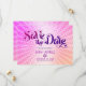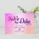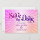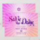 Certifique-se de que todos os seus amigos e parentes poderão celebrar o marco da Bat Mitzvah de sua filha! Envie este cartão postal de "Salve a Data" personalizado, divertido e boho retrô. Uma tipografia moderna e ousada em rosa quente escuro e roxo, sobreposta a um fundo de raios gradientes laranja claro e rosa com pontos brancos. Personalize o texto personalizado com o nome e a data da Bat Mitzvah. Sua mensagem personalizada, uma estrela de Davi roxa e rosa e seu endereço de retorno adornam o verso. Garantido para adicionar diversão elegante à sua ocasião especial!