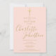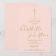 Convite de batismo ou cerimônia de nomeação elegante com letra dourada em rosa bege, apresentando uma assinatura elegante em letra dourada. Personalize com as informações especiais do batismo ou cerimônia de nomeação em letras douradas elegantes em um fundo rosa bege. Criado por Thisisnotme©
