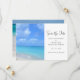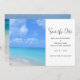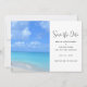 Save the date card with a scenic tropical photograph. A secluded beach with white sand and turquoise water.