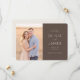 Este convite de casamento apresenta um layout dividido com uma fotografia calorosa e espontânea de dois indivíduos em um ambiente ao ar livre de um lado e texto elegante em um fundo sólido do outro. A paleta de cores inclui tons terrosos como bege e marrom claro, criando uma atmosfera harmoniosa e convidativa. O design combina fotografia digital com tipografia limpa e moderna, usando fontes cursivas para um toque pessoal e fontes serifadas para clareza. O clima geral é romântico e antecipatório, perfeito para celebrar uma ocasião especial com estilo e sofisticação.