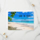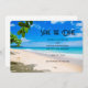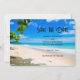 Salve o cartão de data com uma bela fotografia. Uma praia branca arenosa com água azul azure. Relaxando a imagem com um céu ensolarado e um surf espumante gentil com algumas folhas tropicais bonitinhas moldando a imagem.