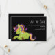 Salve o cartão de data com uma imagem de um unicórnio Frankenstein. Cor roxa e verde. Muito fofo.