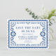 Este belo papel picado inspirou o casamento, exceto a data design apresenta um quadro de ornamentado e texto em azul, branco e tipografia moderna. Esta elegante, porém moderna design é uma escolha fabulosa para um casamento de Latinx ou para o casamento de destino do México. Na parte de trás está sua própria foto horizontal "sangramento de cheio", que pode ser removida se desejar.