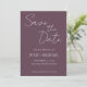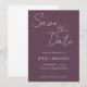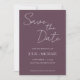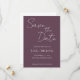 Convites de casamento em estilo simples para salvar a data, apresentando escrita estilizada em branco sobre um fundo na cor berinjela trendy. Edite e substitua nomes, data e local pelos seus. Selecione o tamanho do convite e o estilo do papel.