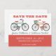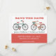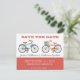 Aqui está um doce e adorável convite para o lançamento da Data para seus futuros núpcias! Diga antecipadamente aos amigos e à família a data do casamento para que possam preparar-se para comparecer. Um par de motos de estilo antigo em cores retrógradas do verde azul-lacrimogêneo e laranja com cores correspondentes e fontes legal retrô. Personalize-o com os seus nomes, data e local da sua cerimônia de casamento. Fundo colorido branco/creme na frente e atrás. Os gráficos de bicicleta são do Rhoda Design Studio em etsy.com