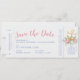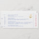 Elegante tema de âncora náutica, salve a data que parece um bilhete de embarque com um buquê boho floral ao redor de um logotipo de casamento de âncora com coração romântico no topo em coral rosa e azul empoeirado claro. As cores e fontes no modelo podem ser editadas, ou simplesmente insira os detalhes da sua viagem e informações da recepção para que os convidados possam começar a planejar sua viagem para o casamento no clube de iates na praia.