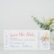 Tema de âncora náutica elegante, salve a data que parece um bilhete de embarque com um buquê boho floral ao redor de um logotipo de casamento de âncora com coração romântico no topo em coral rosa suave e azul poeirento claro. As cores e fontes no modelo podem ser editadas, ou simplesmente insira os detalhes da sua viagem e informações da recepção para que os convidados possam começar a planejar sua viagem para o casamento na praia do yacht club.