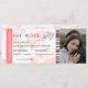 Bilhete de casamento moderno com monograma de cartão de embarque com um fundo branco e salmão simples, uma foto do casal noivo, um avião com uma trilha em loop e um modelo de salvar a data personalizado que é fácil de personalizar. Não se esqueça de atualizar o texto do monograma no verso.
