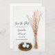 O encantador ninho de pássaros russos e ovos azuis com Pussy Willows Casando Salve a Data do Anúncio define o tom para sua cerimônia e recepção em março, abril ou maio de primavera de inspo casamento. Esta nupcial natural costulhada pela rústica chic mantém o anúncio da data com uma fotografia natural de um ninho de pássaros de madeira cheio de ovos salgados azuis e uma garrafa de leite de vidro vintage com galhos salgados e cetim branco. Disponível como um convite impresso para envio por correio ou como um download digital para fácil compartilhamento digital online.