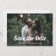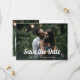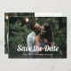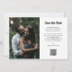 Esse casamento de estilo de tendência e vintage salva o recurso de cartões de data na frente como uma sobreposição na sua foto. O fundo tem um fundo preto e branco, e outra foto, junto com um código de QR digitalizável para adicionar seu site de casamento.