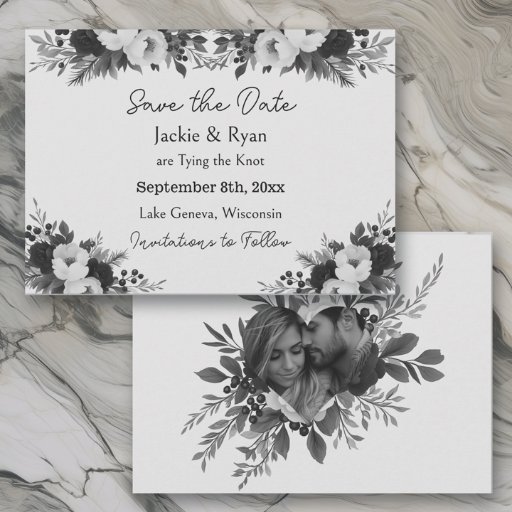 Gorgeous transparent wedding save the date cards with black and white watercolor flowers. Pretty, minimalist floral botanical theme. Add your photo to the heart in the personalize area.