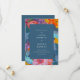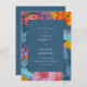 O convite para salvar a data apresenta um design floral em guache, com flores vibrantes, abstrato em pinks, roxas, blues e amarelos. Escovas velhas e texturas paintais criam um sentimento moderno e artístico.