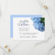 Cartões florais azuis salvos com o script moderno e fontes impressas. Uma flor azul-clara, realista de hydrangea com folhas verdes decora a borda dos cartões brancos. Os nomes estão no topo com um sinal azul claro "&" / e por trás do texto. Inclua a data, o local e uma linha que informa que um convite formal está sendo enviado. O reverso é azul claro sólido. Atualize o jornal para criar um anúncio de casamento extraordinariamente bonito.