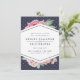 Os cartões salve a data elegantes apresentam uma mistura chic de florais de aquarela vintage e elementos geométricos modernos sobre um fundo azul-da-meia-noite sutilmente padronizado. Um spray de flores cor-de-água cor-de-rosa pincelada espia-se do topo e do fundo de um elemento em forma de diamante central esboçado em azul-da-noite, segurando seus nomes e detalhes de casamento em letras limpas e modernas.
