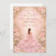 This elegant quinceañera design features a soft blush watercolor background framed by romantic roses, delicate florals, and subtle gold accents, with a graceful gown illustration creating a dreamy, refined atmosphere. The pastel pink palette and floral details give the design a luxurious yet youthful feel, making it perfect for a classic quinceañera celebration with a romantic, garden-inspired aesthetic.