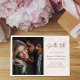 Este design apresenta um cartão de salvamento da data do casamento com um minimalista moderno, um roteiro de caligrafia e design floral de blush, um modelo de foto simples e detalhes do site de código QR.