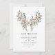 Convite de casamento em tons de marrom poeirado com bolas de seda de algodão rústico e folhas de eucalipto com penas e chifres boho. Ideal para qualquer tema ou casamento de jardim.