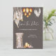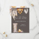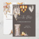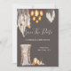 Uma ilustração maravilhosa e vibrante com belas penas de macramê penduradas ao lado de um lustre de cesto de vime cintilante falso. Uma única cadeira de madeira coberta com tecido macio e transparente, orquídeas, flores de anemona e penas boho tem um porta-velas de aço / metal e porta-velas de vime oval em pé ao lado, que parecem estar brilhando, colocados contra um fundo marrom carvão enevoado. Este design elegante e sofisticado é ideal para casamentos rústicos no campo no outono; para casamentos de verão, primavera e outono; para anúncios de "salve o dia" de safári africano ou inverno.