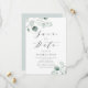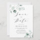 Reserve a Data! Anuncie seu evento com este Bar personalizável Mitzvah, salve o anúncio da data. Este convite de morcego verde mitzvah apresenta folhas de eucalipto azuis empoeiradas de cor d'água com um roteiro cômico. Personalize adicionando seus próprios detalhes. Este Bar de eucalipto Mitzvah que salvou a data é perfeito para qualquer estação e tema.