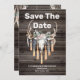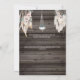 Uma ilustração de uma caveira de veado colocada contra um fundo marrom de madeira tem um macramê lindamente trabalhado pendurado em seus chifres, que é infundido com penas de pássaros selvagens, folhas e sementes. Lindas rosas cor-de-rosa florais e folhagens repousam sobre sua testa e modelos de texto em negrito branco aparecem acima e abaixo dela para sua redação personalizada. Os cantos superiores traseiros têm penas tribais penduradas neles, adornadas com buquês de folhagem de rosa e uma planta de macramê pendente. Ideal para casamentos tribais, country, rústicos, ao ar livre, boho, floresta e bosque.