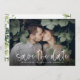 Casamento moderno de chic Salve os cartões de data com um design de dois lados com fotos e texto. Na parte frontal, adicione a foto de sangria do seu cheio com uma sobreposição de texto minimalista e uma letra de script de letras manuais. O verso tem espaço para todos os detalhes adicionais do casamento rodeados por uma bonito estrutura botânica de folhas e galhos de madeira boho. Use as ferramentas de design para editar fontes de texto e cores ou adicionar mais fotos a design a um anúncio exclusivo de Salvar a Data do seu casamento.