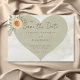 Aceite o charme livre e espirituoso de boho elegance com nosso casamento encantador, salve o cartão de data. Apresentando um fundo verde de lavagem com aquarela verde de calcanhar calcário calcário, a peça central é um coração verde mais escuro, enfeitado com aglomerados de girassóis amarelos macios, castanhos e verdes. O cabeçalho da fonte do script moderno e o texto transparente e casual do corpo oferecem um toque contemporâneo, estilo perfeitamente equilibrado e fácil. Esta design capta lindamente a essência da sua história de amor, convidando seus convidados a comemorar num cenário de beleza natural e sofisticação relaxada. Placas gráficas de girassol criadas pela Verya Studios. Criado pela imprensa simplesmente de farmácia.