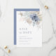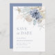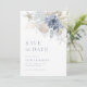 Boho Rustic Elegante Simple Beach Blue Casamento Salve O Convite De Data. O estilo boêmico arranjou conchas balneares minimalistas com deliciosos e simples peixes-palha e corais de bolor azul e creme em água impressa à mão. Por favor, edite a parte de trás do convite com a sua foto. A cor de fundo azul é linda para casamentos de boho e casamentos de praia. Convites editáveis para primavera, verão, outono (outono) e casamentos no inverno.