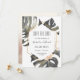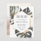 Um belo casamento do na moda de boho tropical Salve o cartão de datilografia com sua luxuosa botânica tropical aquática que inclui orquídeas de pêssego bege e e rosas queridos com folhagem de folha Monstera. Um quadro geométrico dourado rodeia o texto no estilo moderno. Personalize o modelo de texto com os detalhes do casamento.