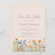 Este design de bico rústico apresenta uma borda de cor d'água de flores silvestres laranja e azuis ao longo do fundo. As palavras "Salvar a Data" e os nomes dos casais aparecem no script de escrita manual de cinzas de carvão na moda, com o texto restante na fonte sans serif em um plano de fundo cor-de-rosa pincelado.