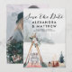 Boho Winter Woodland Férias Foto Salvar a Data - apresenta uma adorável paisagem florestal boho e tipografia de roteiro deslumbrante. A foto do Noivo e da Noiva em bleed total é apresentada no verso do cartão. Nosso modelo de alta qualidade torna muito fácil para você substituir nosso texto pelo seu.