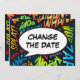 Personalize com seus nomes e detalhes para anunciar a mudança de data do seu evento especial. Tema de arte pop de história em quadrinhos moderno, divertido e retrô, perfeito para casamentos, chás de noiva, chás de bebê, batizados, festas de noivado, celebrações de aniversário, formaturas, festas de aniversário e outros eventos especiais ao longo do ano! Um design legal, moderno e divertido que dá um toque especial ao seu dia. Criado por Thisisnotme©