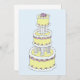 Um bolo de três andares, elegante, com cores pastéis, colocado contra um fundo azul pastel.
