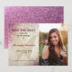 Anuncie seu grande dia com elegância e brilho usando este cartão de save the date de Quinceañera. O lado esquerdo apresenta uma borboleta dourada brilhante sobre um fundo rosa-bege e efeito glitter com caligrafia moderna em burgundy e preto. O lado direito inclui uma foto pessoal da aniversariante, adicionando um toque sincero e sofisticado. Totalmente personalizável com seu nome, data e detalhes, este design é perfeito para uma celebração de Sweet 15 glamurosa e memorável.