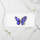 Borboleta de flores cinza, azul, safira, espumante com asa decorada com flores preciosos azuis com folhas de ouro sobre fundo branco.