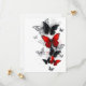 Bando de borboletas voadoras, realistas, vermelhas e pretas em fundo branco com gotas de tinta.