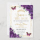 Defina o tom do seu dia especial com este lindo cartão de Save the Date floral roxo escuro real, perfeito para casamentos, Quinceañeras, Sweet 16, Bar Mitzvahs, chás de noiva e mais. Com flores roxas ricas, borboletas graciosas, uma moldura geométrica dourada elegante e detalhes dourados cintilantes, este design captura a elegância moderna com um toque luxuoso.
