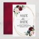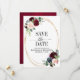 Modelo de cartão de "salve o dia" para casamento floral rústico country classe com vermelho borgonha e rosa beije azul marinho em aquarela com folhagem botânica verde e folhas de eucalipto em fundo borgonha sangue de boi. Este lindo design fácil de personalizar pode combinar facilmente com as cores, estilos e tema do seu casamento e é uma escolha perfeita para casamentos country de outono, verão ou inverno. Você pode encontrar mais designs correspondentes na minha loja ou entrar em contato comigo se precisar de ajuda na personalização do design.