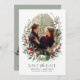 Featuring a delicate gold geometric frame encircling a lush watercolor wreath adorned with vibrant red berries, and greenery, this design combines seasonal charm with timeless elegance, making it ideal for Christmas themed weddings.