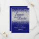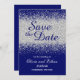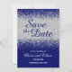 Este moderno e clássico cartão "Salvar a Data" tem um efeito reluzente sobre um rico fundo azul real. Você pode personalizar o estilo e a cor da fonte da maneira que quiser, bem como alterar a cor do plano de fundo da placa. Isto é parte de uma bela suíte de casamento que pode ser totalmente personalizada.