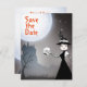 Este anúncio personalizado de Save the Date para casamento apresenta um charmoso casal de bruxa e caveira. Um anúncio encantador para qualquer casamento e uma escolha perfeita para o feriado de Halloween.