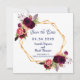 Um casamento elegante e romântico Salve o cartão de Data. Um quadro fino de cor dourada, em forma geométrica, com rosas de cor d'água do estilo boho, flores em burgundy e rosa. Modelos para seus nomes, data e local do casamento. Fundo branco na frente. Marinho de letras azuis. Traseira: fundo marinho azul colorido.