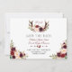 Convite de design de carta com antílope floral vermelho Burgundy rústico, buquês florais de aquarela magníficos, flechas com corações e buquê floral como divisor; no verso, um fundo azul oceano elegante com buquês florais de canto de aquarela encantadores. Use a ferramenta Personalizar para adicionar suas informações. Você pode alterar fontes e cores. Para itens correspondentes, visite minha Coleção de Antílope Floral Burgundy Blush Marsala.