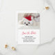 Salve o cartão de encontro com uma fotografia adorável de um cãozinho branco giro vestindo um chapéu vermelho de natal.
