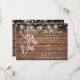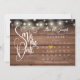 Este lindo cartão de save the date apresenta luzes de corda e um calendário e um lindo coração de amor dourado destacando a data especial em um fundo de painéis de madeira rústica.