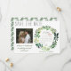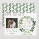 Avise amigos e familiares que você está se casando com esses simples cartões de anúncio de save the date em aquarela. O design apresenta tipografia rústica e uma grinalda de folhagem verde pintada à mão em aquarela. Uma foto adorável do casal feliz adiciona um toque especial, assim como o calendário personalizado. Perfeito para um casamento de primavera ou verão.