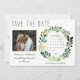 Deixe amigos e familiares saberem que você está se casando com esses cartões simples de anúncio de save the date em aquarela. O design apresenta tipografia rústica e uma grinalda de folhagem verde pintada à mão. Uma foto adorável do casal feliz adiciona um toque especial, assim como o calendário personalizado. Perfeito para um casamento na primavera ou verão.