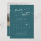 Este calendário de fotos de código QR azul-lacrimogêneo, azul-lacrimogêneo, salva que o cartão de data é perfeito para um casamento minimalista. A ousada joia da turquesa azul-escura do moderno design da boêmia apresenta uma caligrafia rústica simples com um estilo único, mas clássico. Personalize sua data de salvamento com o calendário do mês do seu casamento, com um coração na data do seu casamento, seus nomes, local do casamento, uma foto de noivado e um código QR que liga ao seu site de casamento.