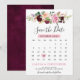 Cartão de calendário botânico floral roxo roxo elegante e temperamental para salvar a data, apresentando um buquê de rosas e peônias em aquarela pastel suave em tons de burgundy, marsala, vinho tinto, roxo, ameixa, rosa beijado, pêssego e creme com folhas botânicas verde exuberante e folhas de eucalipto e moldura geométrica com brilho dourado. Uma escolha de design moderno que é perfeita para casamentos temáticos de primavera e verão em tons de ameixa roxa e rosa beijado. Encontre mais designs e variações correspondentes na minha loja "blissweddingpaperie". E sinta-se à vontade para entrar em contato comigo para personalização adicional ou itens correspondentes.