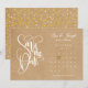 Este lindo cartão de save the date apresenta um calendário e um lindo coração de amor dourado destacando a data especial em um fundo kraft rústico. O verso apresenta confetes de coração dourados em um fundo kraft rústico correspondente.